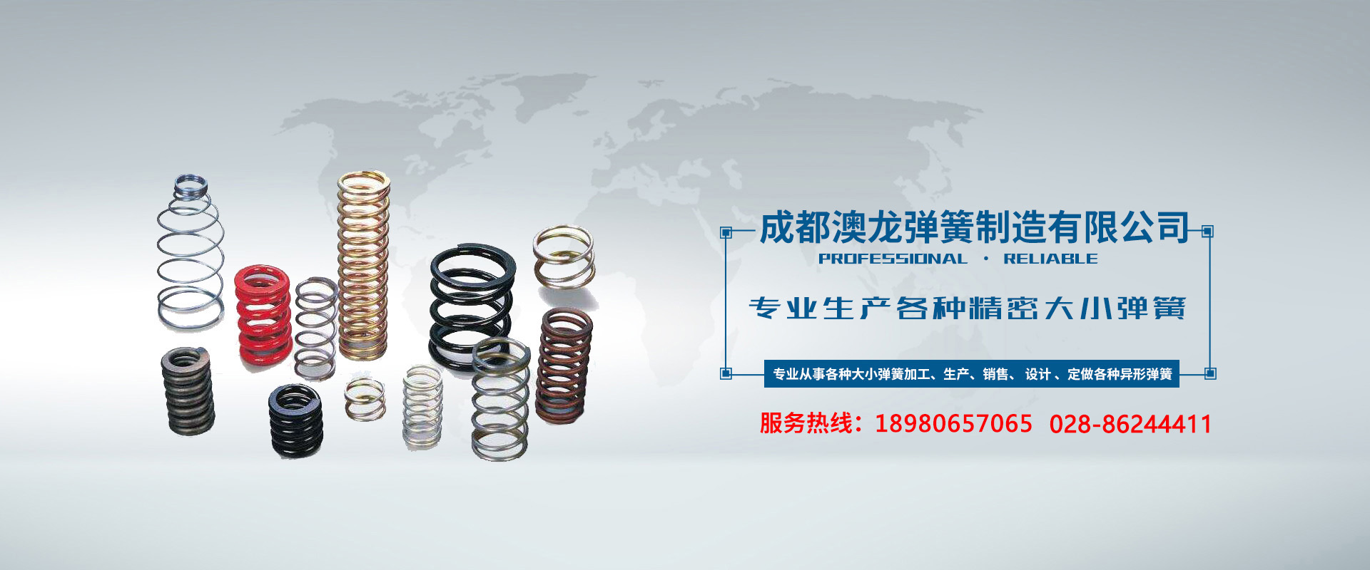 成都澳龍彈簧制造有限公司是一家專業從事各種大小彈簧加工、生產、銷售、 設計 、定做各種異形彈簧、專業生產各種精密大小彈簧、壓簧、壓縮彈簧、扭簧、雙扭簧、拉簧、卡簧、電池彈簧、 電子、電器開關彈簧、 工藝彈簧,汽車坐墊彈簧、氣門、閥門彈簧、碟形彈簧、異形扭簧、蝸卷彈簧、恒力彈簧、離合器彈簧、摩托車減震彈簧、汽配、摩配彈簧、汽車懸掛彈簧、制動彈簧、模具彈簧、沖壓件彈簧、沙發彈簧、床墊彈簧、彈簧包系列等等,并承接各種小五金、沖壓件機械及特定、不規則彈簧的加工服務。